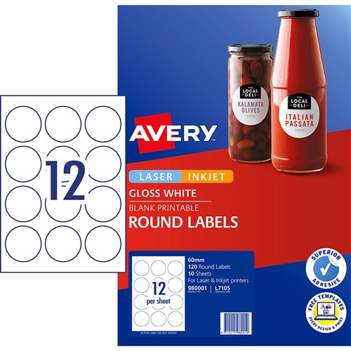 Avery Blank Printable Labels L7105 60mm Round Gloss White 12UP 120 Labels 10 Sheets