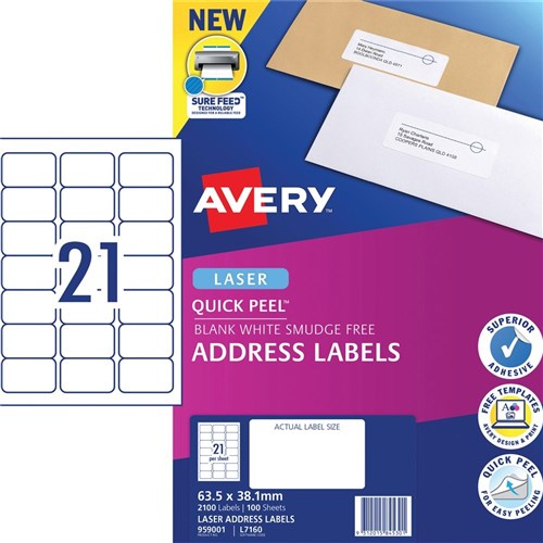 Avery Quick Peel Address Laser White L7160 63.5x38.1mm 21UP 2100 Labels 100 Sheets