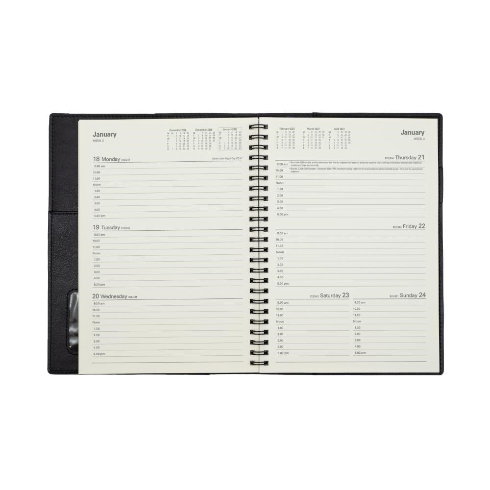 • Ideal for those 'on the move' with its double wiro binding and heavily grained metallic and matt PU cover.