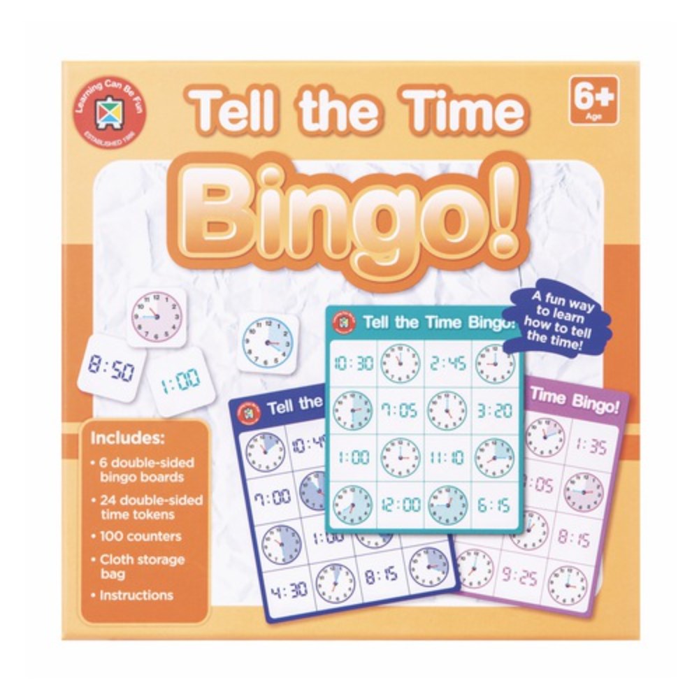 • Includes: 6 double-sided bingo boards, 24 double-sided time tokens, 100 counters, cloth storage bag and instructions.