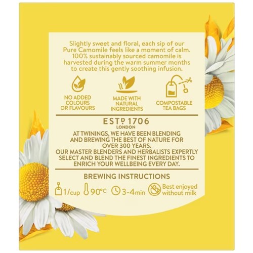 • The tea is made using camomile leaves and is naturally caffeine free.
