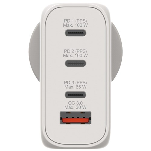 • Consolidates multiple chargers into one, combining two USB-C PD 100W ports, one USB-C PD 65W port and one USB-A QC 3.0 port in a sleek palm sized design.